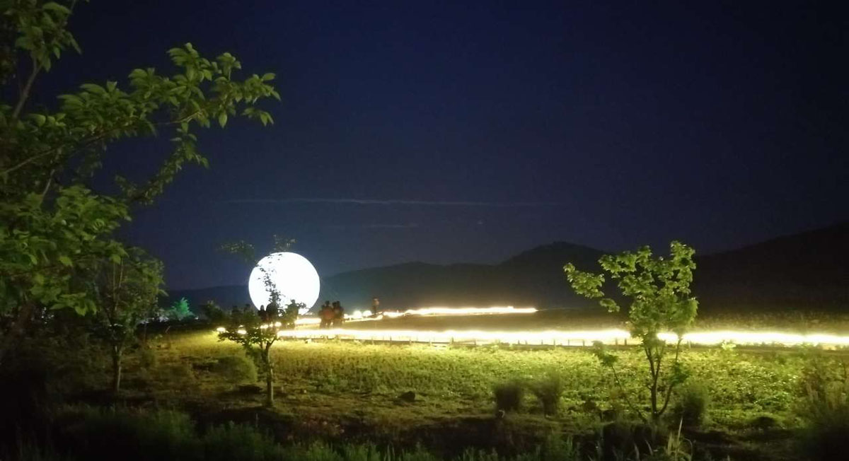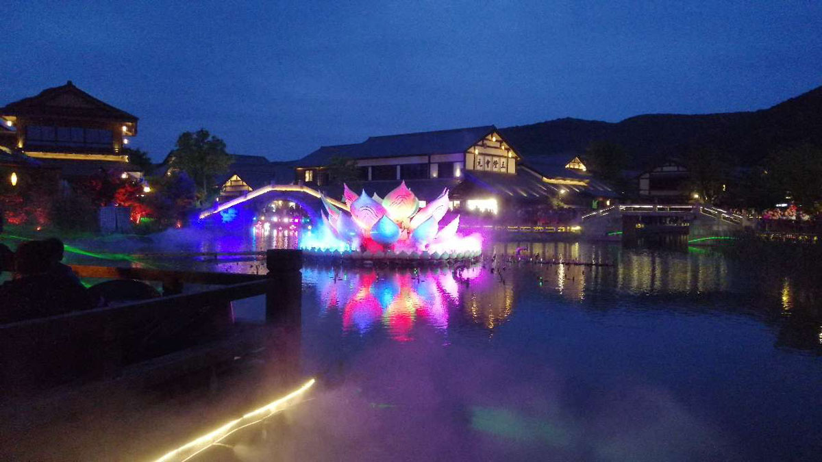 拈花灣景點還有很多,拈花塔、妙音臺、梵天花海、福田閣、禪樂館還有獨特的拈花客棧等,每一處都讓人留戀不舍,這里就不一一敘述了。身邊的美景讓人陶醉忘卻了時間,轉眼間已到傍晚,夕陽照射在古鎮上,仿佛為他披上金燦的紗衣是那么的美麗,金光普照的晚霞已經落幕,古鎮的人漸漸增多。原來古鎮的夜景才是主題,隨著夜幕降臨,五彩炫麗的燈光秀拉開帷幕。湖中的水幕電影科技感十足,在花草綠水旁觀賞電影,實屬人生的第一次,感受非凡。走在小樹林中,在五彩燈光的照影下,加上人工噴霧制造出雨霧繚繞的氛圍,仿佛來到仙境般的美妙讓人陶醉。踏著悠閑的步伐來到了蓮花噴泉,隨著音樂的旋律,水中的噴泉不斷的變換形態,平鏡的湖面上就像有人在跳舞,炫麗的燈光、動感的音樂、舞動的旋律加上圍觀人員的吶喊聲、歡呼聲使整個現場沸騰起來,簡直就是一場音樂狂歡會。